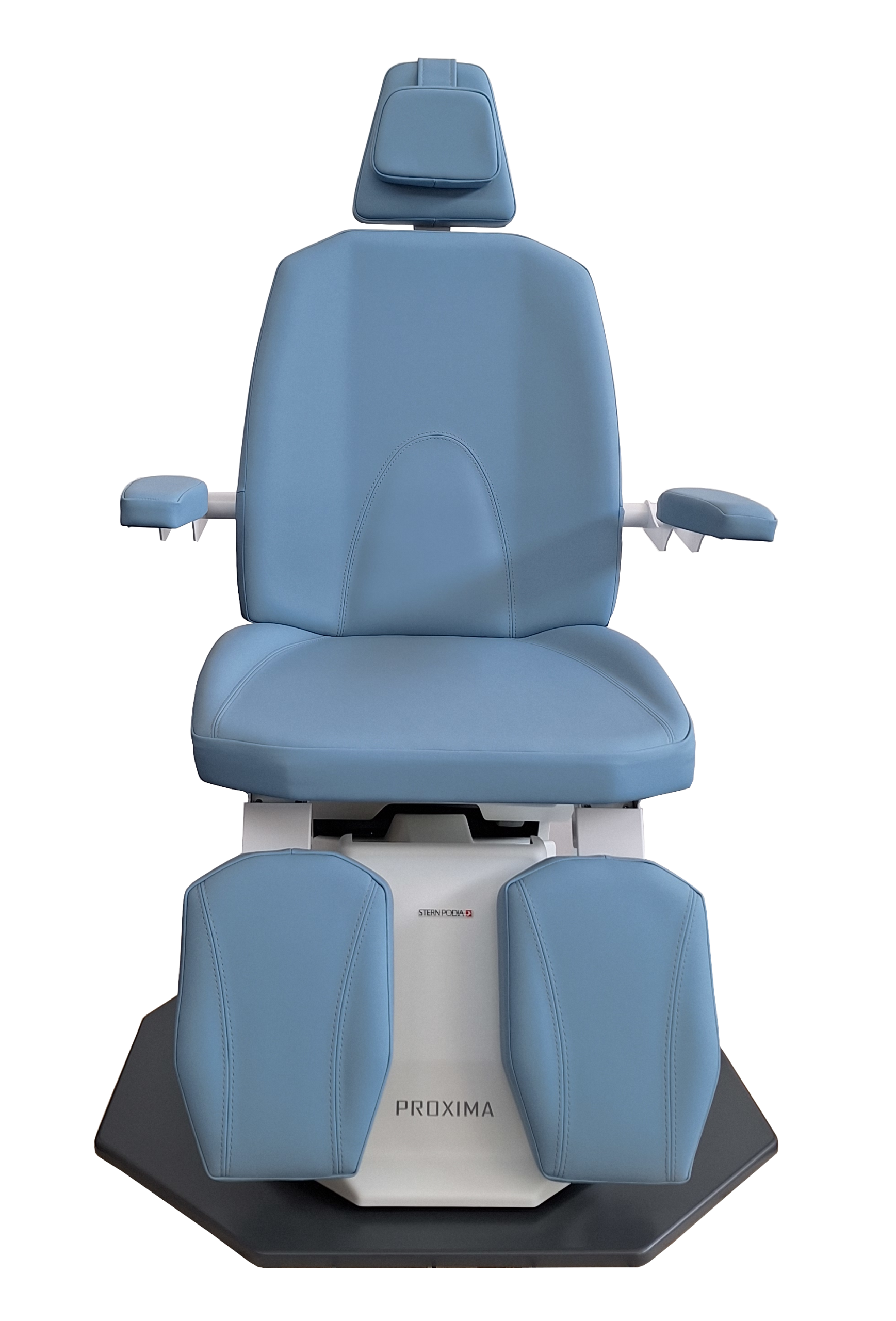 De Proxima Comfort 3M is een nieuwe designvolle behandelstoel en combineert functionaliteit, compactheid en ergonomie. Deze behandelstoel heeft 3 motoren waardoor elk onderdeel van de stoel apart bediend kan worden. De lage instaphoogte van 46 cm geeft iedereen de mogelijkheid om makkelijk in- en uit te stappen. De zithoogte gaat tot 91 cm en de maximale hoogte aan de voet is 142 cm. De armleuningen zijn inklapbaar en gesynchroniseerd met de rugleuning. De beensteunen zijn draaibaar en worden bediend met een gasveer of elektrisch. De bekleding bestaat uit 100% PVC materiaal. De kussens zijn van 20 mm polyurethaan schuim voor extra comfort. Voorzien van een wireless voetpedaal met 3 vrij programmeerbare standen en de uitstapstand. Deze kan ook gekoppeld worden aan een SternPodia pedicure unit.